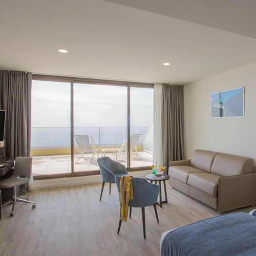 我们的 家庭客房残疾人 面积为 35 至 40 平方米,宽敞、舒适、明亮,宽大的落地窗通向一个约 18 平方米的私人露台,在那里您可以欣赏地中海独特的美景。 房间设有无障碍设施,为行动不便者提供诸多便利。